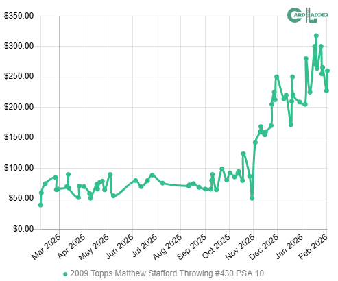 ❌ Matthew Stafford 🏈 - He’s dropped a bit since elimination, but he’s still WAY up since November (specifically looking at his Topps Throwing PSA 10 rookie). I just think it’s going to be tough for him to hit these highs again. If he retires, there’s no more Super Bowls coming his way. Even if he keeps playing, it’s hard for teams to get that far in the playoffs, plus he’s got concerning back issues. Lock in the profit, I say.